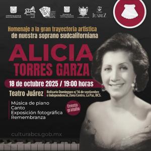 Amigos les invitamos al Homenaje público que realizaremos a la trayectoria artística, de más de cinco décadas, de la soprano sudcaliforniana Alicia Torres Garza, quien está próxima a cumplir sus 92 años de edad. Una de las sudcalifornianas más destacadas a lo largo de la segunda mitad del siglo XX, Profra. Alicia Torres Garza, quien realizó sus estudios musicales con Eulalia Ruíz y Fanny Anitúa, en la Cd. de México. Debutó en 1960, interpretando el rol de Musetta en La Bohéme de Puccini. Se ha hecho acreedora a diversos premios en México, Centro y Sudamérica, Estados Unidos, Italia y Austria, entre otras participaciones artísticas.