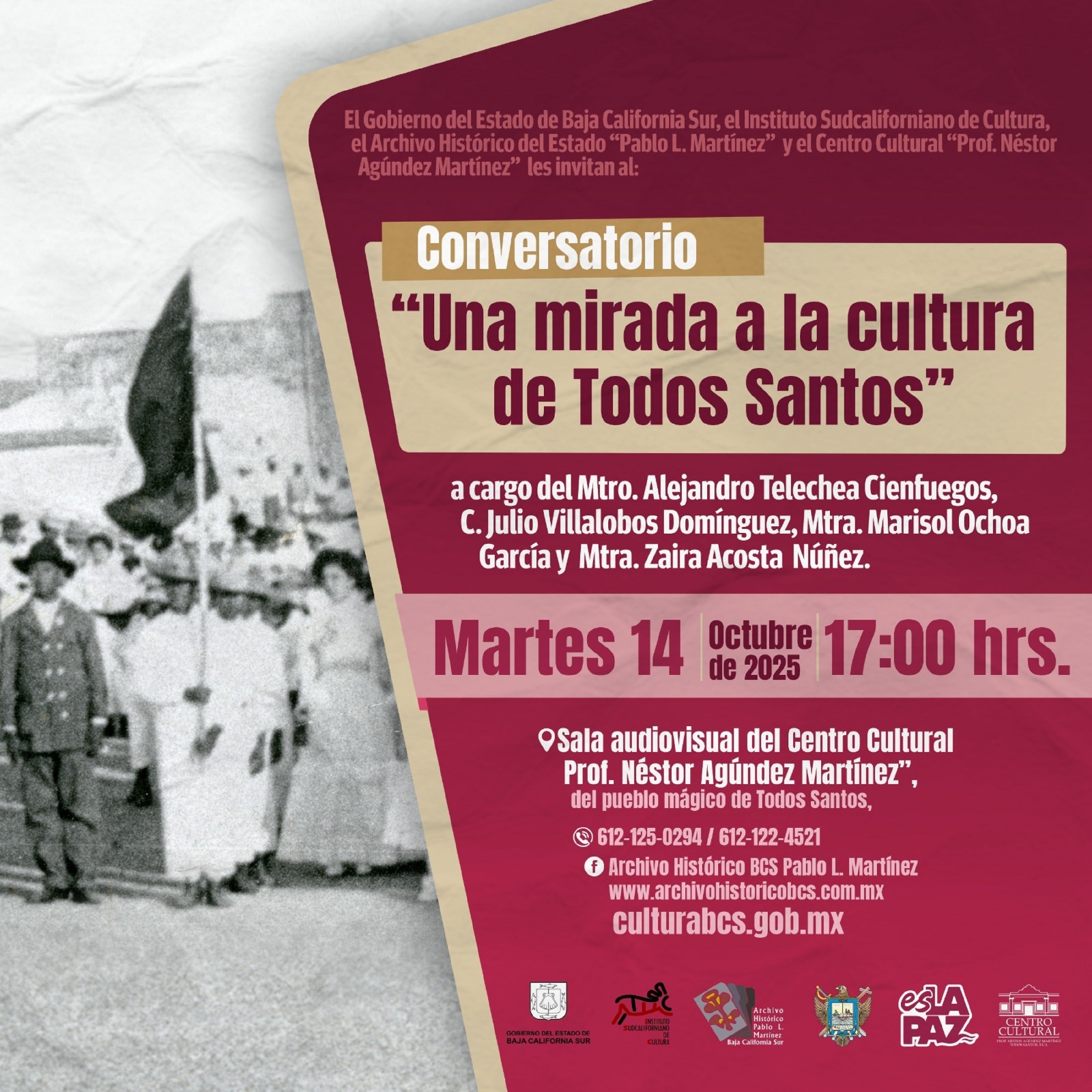 El Gobierno del Estado de Baja California Sur, el Instituto Sudcaliforniano de Cultura y el Archivo Histórico del Estado de Baja California Sur "Pablo L. Martínez", en coordinación con el Centro Cultural "Prof. Nestor Agúndez Martínez" de Todos Santos BCS, les invitan al conversatorio: